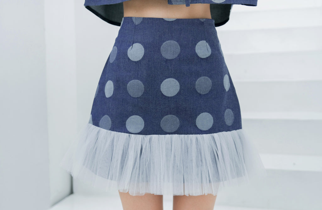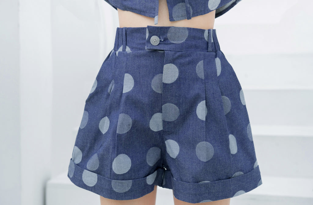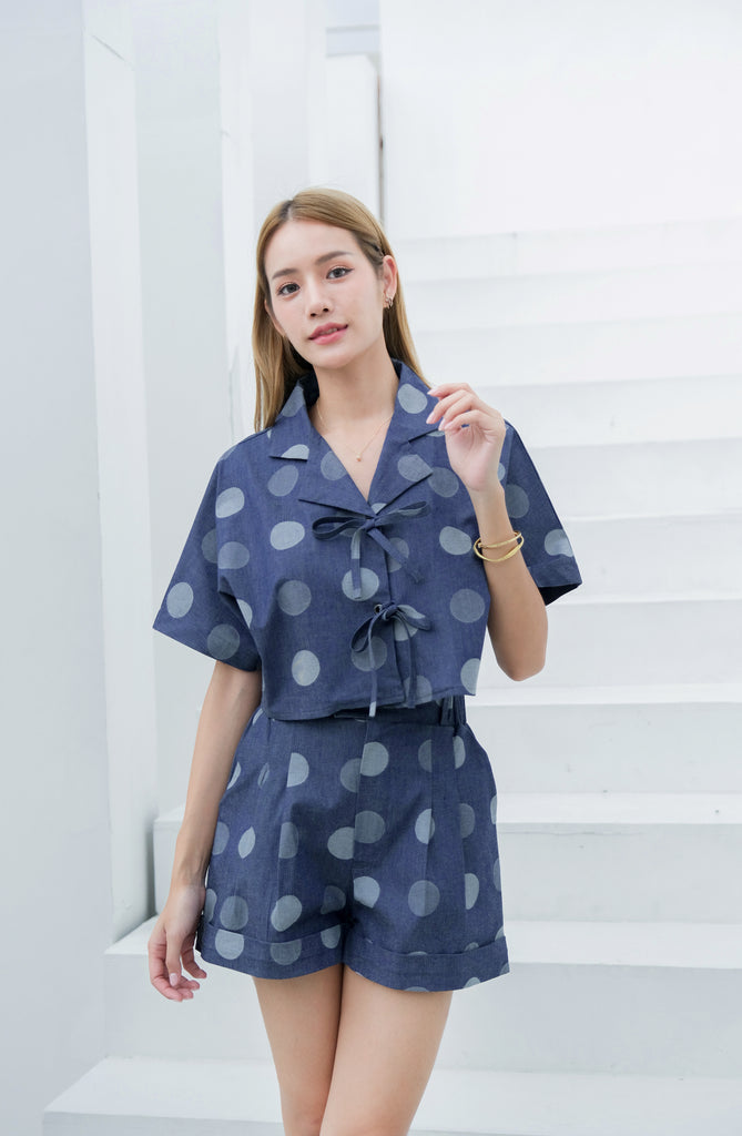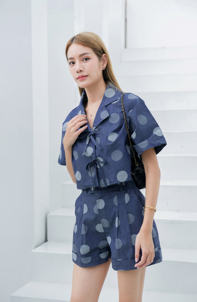 Ramsita Maria Polka Dot Jean Set เซ็ตเสื้อครอป Oversize แขนในตัว กางเกงขาสั้น และกระโปรงสั้น ลายจุดน่ารักมากค่ะ